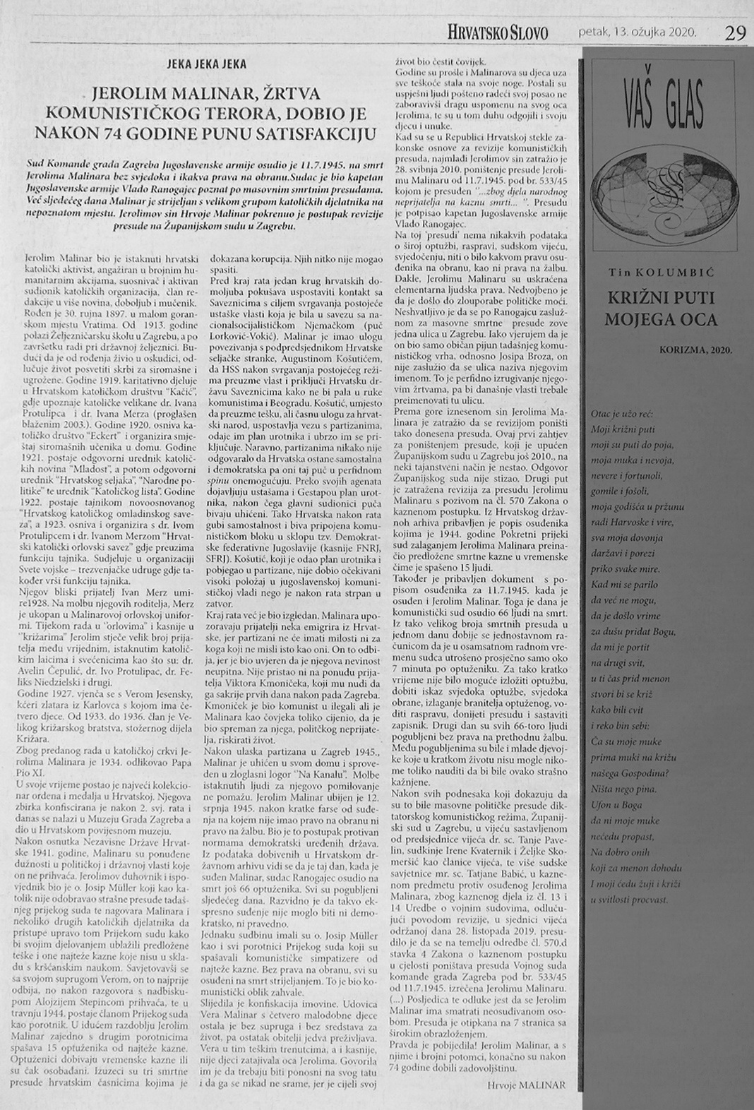 JEROLIM MALINAR, ŽRTVA KOMUNISTIČKOG TERORA, DOBIO JE NAKON 74 GODINE PUNU SATISFAKCIJU