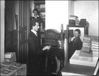 Jerolim stoji uz prešu za zlatotisak, a Vera iznad njega. Jerolima Malinara