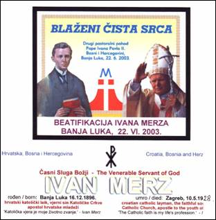 Na dan 22. lipnja 2003. godine Sveti Otac Ivan Pavao II došao je u Bosnu i Hercegovinu, da bi na apostolskom putovanju u gradu Ivanovog rođenja, u Banjoj Luci slugu Božjega Ivana Merza proglasio blaženim. To je u Hrvata prvi laik (čovjek koji ne pripada svećeničkom staležu), koji je proglašen blaženim. (Postulator beatifikacije bio je isusovac otac dr. Božidar Nagy.)