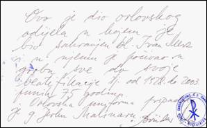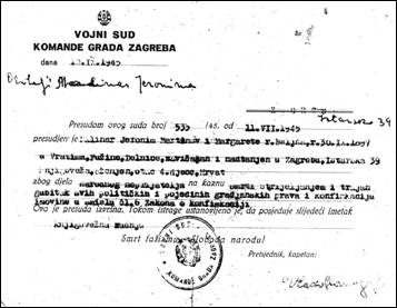 Prijepis originalnog teksta presude, a ispod toga je slika presude poslane Jerolimovoj obitelji dva mjeseca po izvršenju presude.