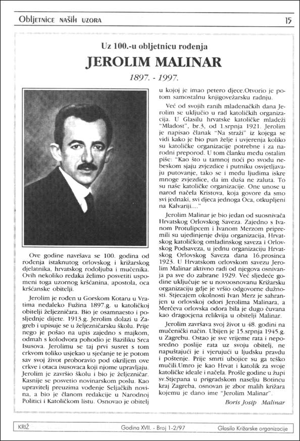 Dozvolite da Vam se najprije zahvalim na prijedlogu, da mi uručite djelić orlovske uniforme u kojoj je bio pokopan i počivao blaženi Ivan Merz, a koja je bila od mog oca Jerolima Malinara. Vaša ponuda i Vaša briga o tome, da dio te svete relikvije dođe u ruke i Jerolimovom potomku, bila je za mene neočekivana i toliko iznenađujuća, do suza dirljiva, da mi je trebalo vremena, da se emocionalno smirim. O tatinom posljednjem počivalištu do danas ne znamo ništa, niti ne naslućujemo gdje bi mogao biti pokopan i sada od Vas dolazi prijedlog, da mi uručite komadić tatine orlovske odjeće (uniforme) u kojoj je bio pokopan i počivao 75 godina sveti čovjek, dr. Ivan Merz, čovjek kojeg je moj otac neizmjerno poštivao. To je u meni pobudilo sjećanja i emocije na njih obojicu, na jednog svetog čovjeka i blaženika, a drugog mučenika za svoje ideale i svoje katoličko opredjeljenje. Jednog za kojeg znamo gdje počiva i koji je podignut na rang oltara, a drugog o kome se ne govori, za kojeg ni ne znamo gdje su mu posmrtni ostaci. I danas blizu šest desetljeća od njegove mučeničke smrti mi, njegova djeca, osjećamo neizmjerno veliki gubitak, veliku prazninu u obitelji po njegovom odvođenju i likvidaciji, ali i neizmjerno divljenje prema tom poštenom, skromnom, radinom, humanom i u svojoj dobroti neizmjerno naivnom čovjeku, ali u duši pravom katoliku i odanom suprugu, uzornom ocu i poštenom Hrvatu, koji je podjednako poštivao i cijenio sve ljude, bez obzira na njihovu vjeru, društveni status, različitost svjetonazora, životnu opredijeljenost ili narodnost, i u svim ljudima vidio je samo dobro.